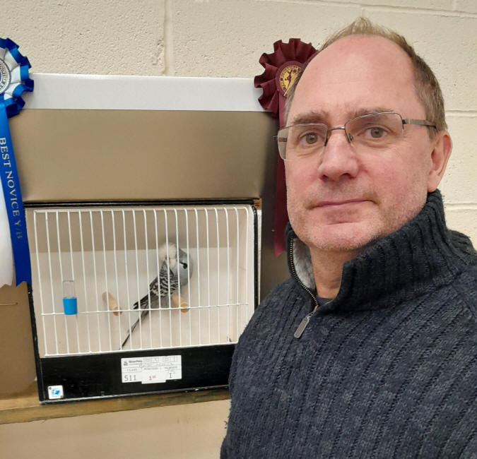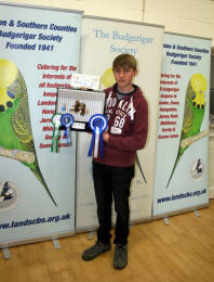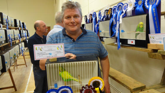 Anthony Andrews from Wales won both novice sections. His white blue cock won the any age section while his yellowface skyblue cock headed the young bird section followed by a light green cock in second place.  James Folly was second and third best any age with a yellowface cinnamon skyblue cock and lacewing yellow hen. Mark Bannister benched an opaline grey green cock to win third best young bird.