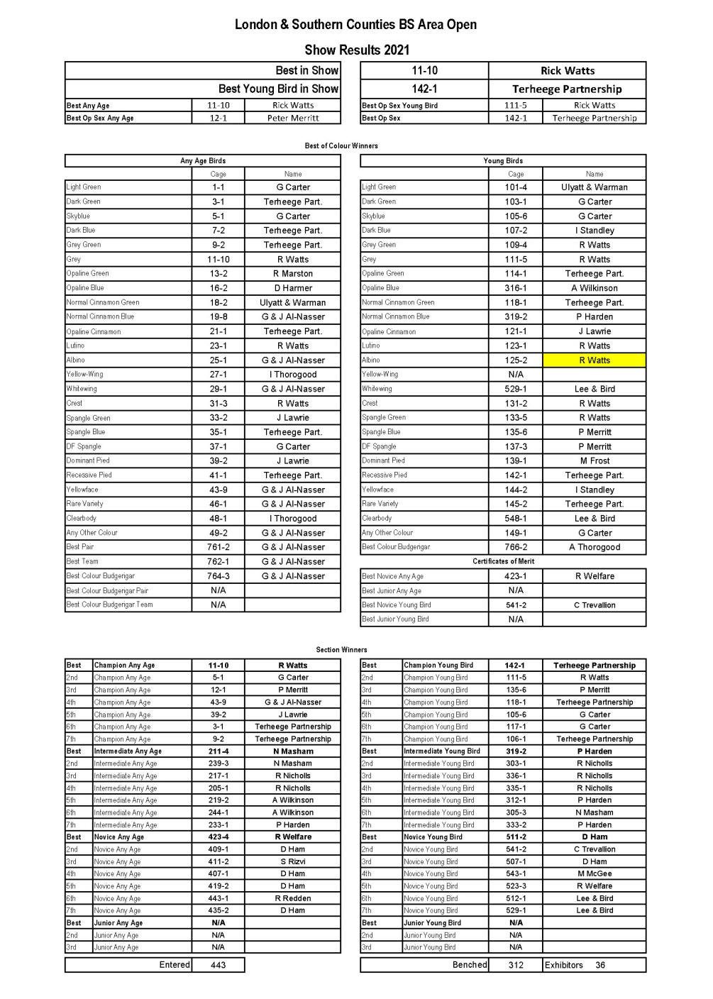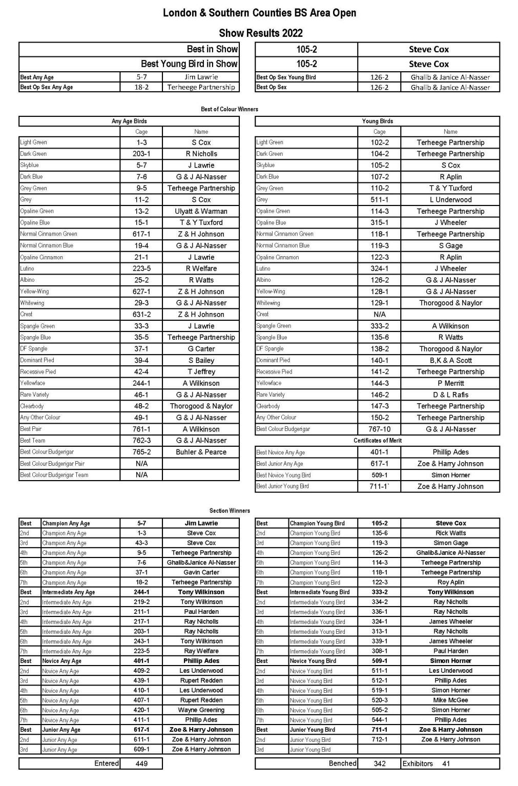 Best In Show & Best Young Bird Steve Cox Best Any Age Jim Lawrie Best Any Age Opposite Sex Terheege Partnership Best Young Bird Opposite Sex G & J Al-Nasser