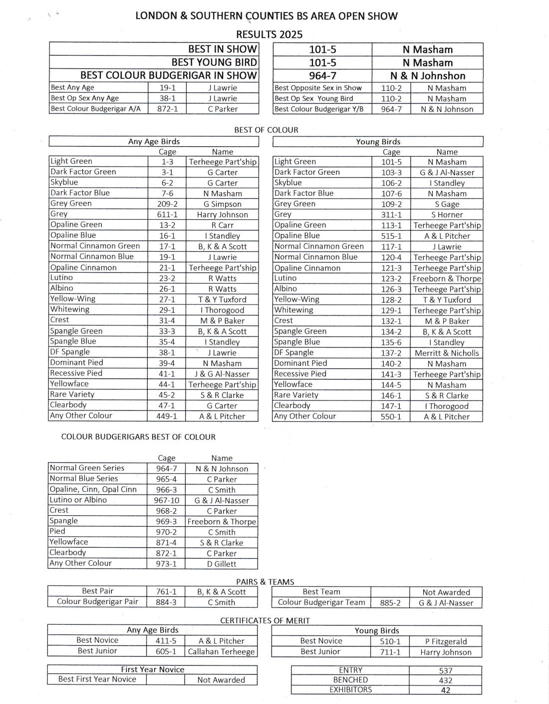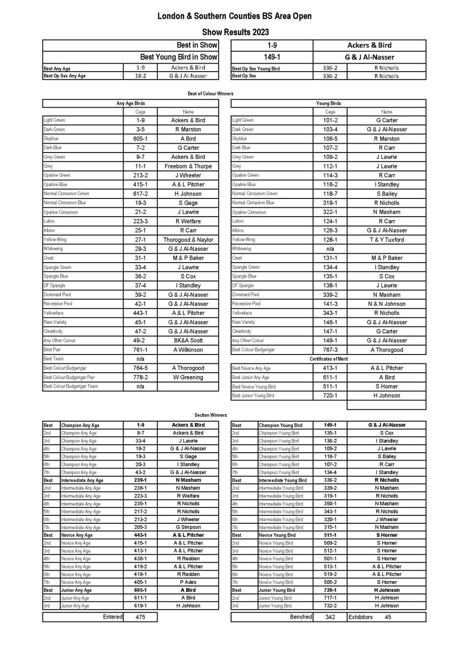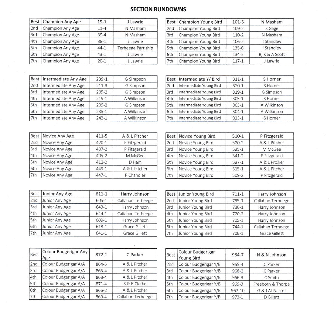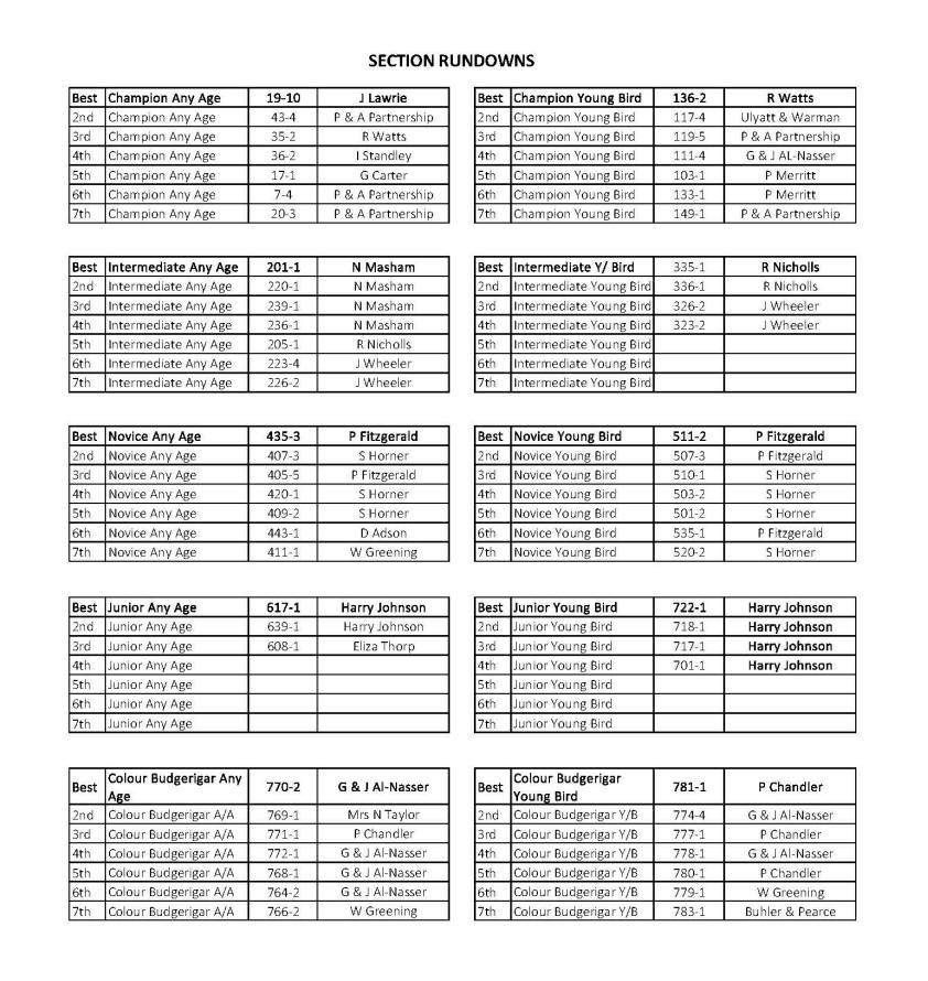 Novice Any Age 407-5 N Masham Novice Young Bird 513-2 P Harden